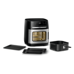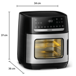Este horno 2 en 1 funciona como horno tradicional y como Airfryer, permitiendo freír, hornear, asar, tostar, deshidratar, recalentar, fermentar y más. Su pantalla táctil intuitiva cuenta con 10 programas automáticos, como papas fritas, pollo, pescado, pizza, pastel, yogur y otros.