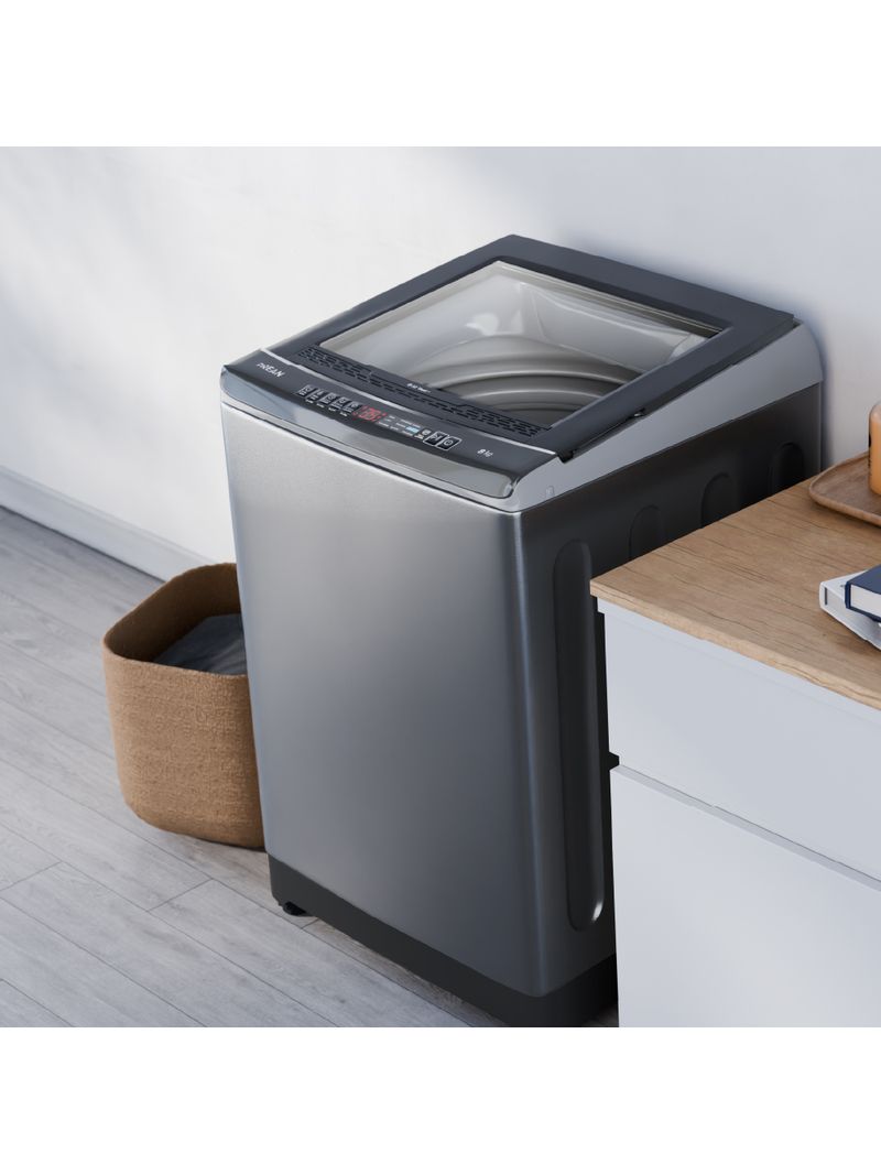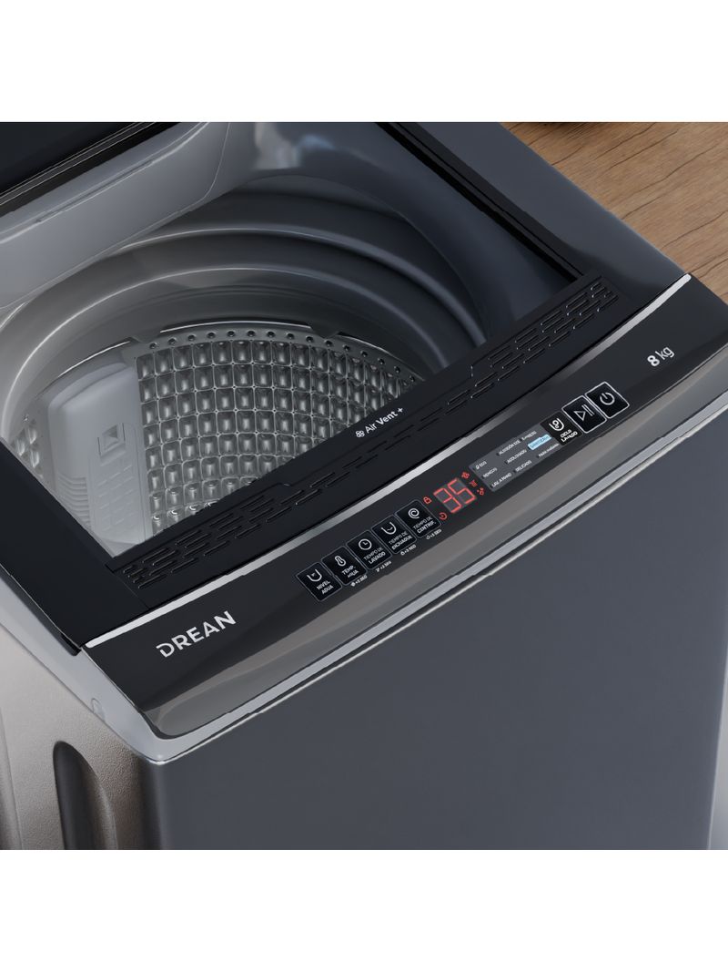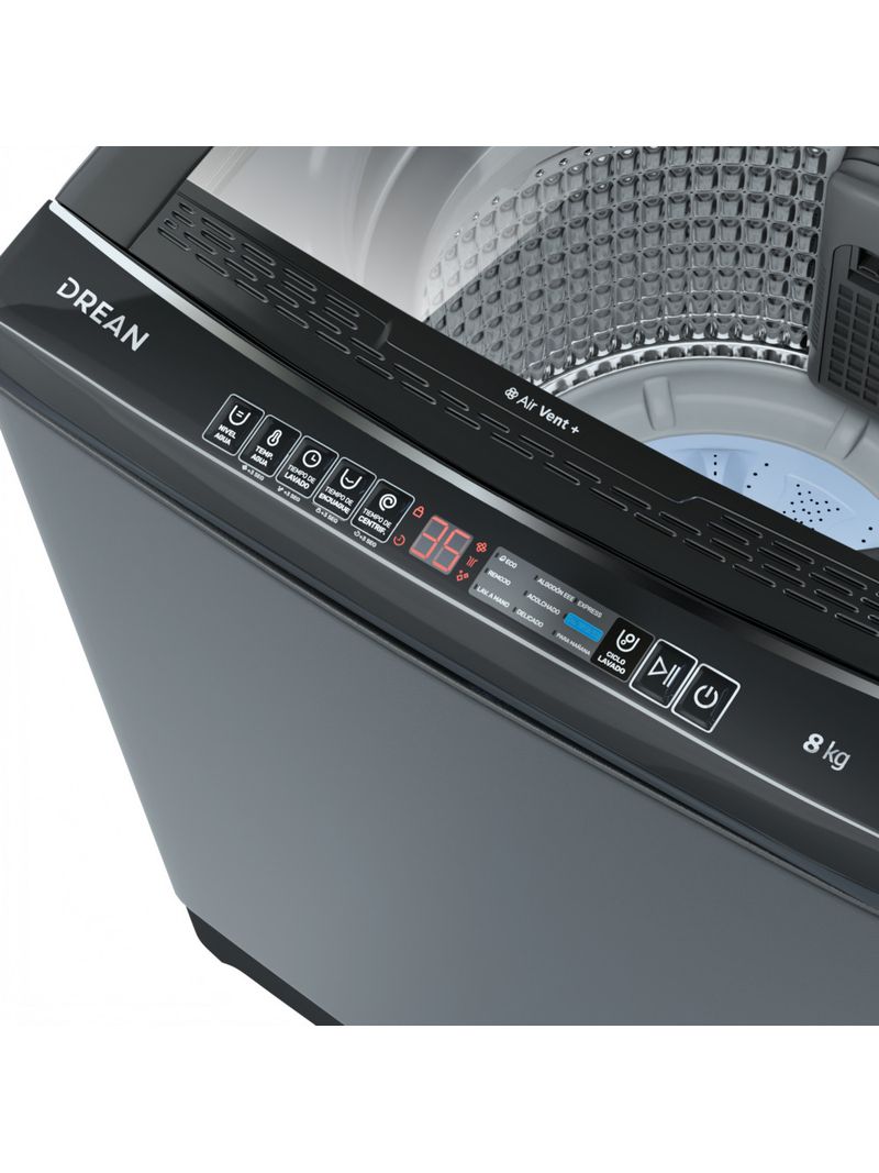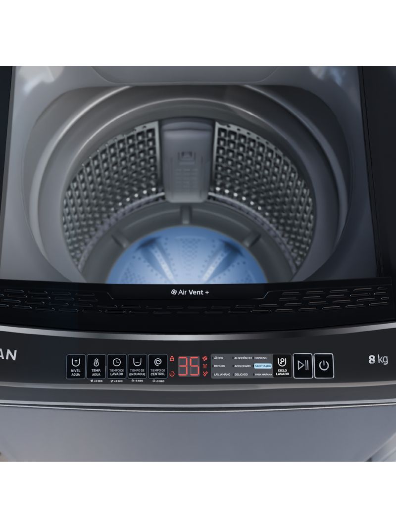 Lavarropas de carga superior. Su capacidad de lavado es de 8 Kg y su velocidad de centrifugado regulable hasta 660 RPM. Color gris. Eficiencia A+. Sistema de lavado oriental. 9 programas de lavado entre ellos: ECO, Express y Acolchado. Display LED. ID System con ajuste de agua inteligente. Inicio diferido hasta 24 hs. Tambor de acero inoxidable con tecnología Pillow Drum y doble filtro atrapapelusa. Tapa de vidrio con cierre Soft Close. Función de secado y aire fresco. Alarma fin de lavado.