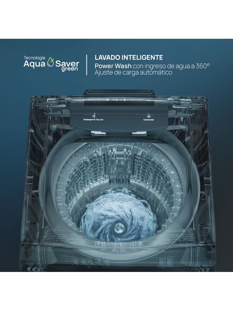 Ahorrá agua en el lavado con Aqua Saver Green. El ID System detecta el peso de la ropa y ajusta automáticamente el agua, el tiempo y el movimiento. Power Wash enjuaga en cascada 360°, eliminando el jabón y logrando una limpieza más eficiente.