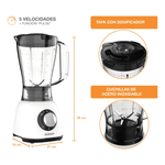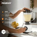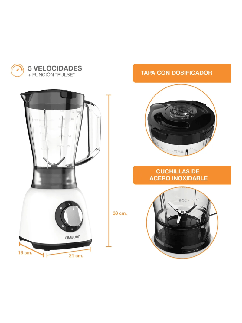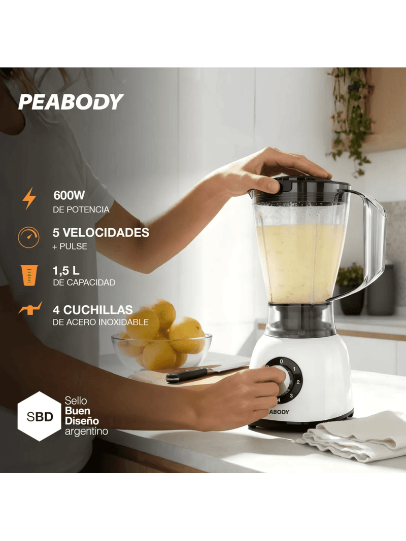 La Licuadora Peabody PE-LN610B en color blanco es la herramienta ideal para quienes buscan eficiencia y estilo en su cocina. Con una potencia de 600 W y cinco velocidades, esta licuadora permite preparar desde batidos hasta salsas con facilidad. Su jarra de plástico de 1.5 L es perfecta para satisfacer las necesidades de toda la familia, garantizando un uso doméstico práctico y funcional.
