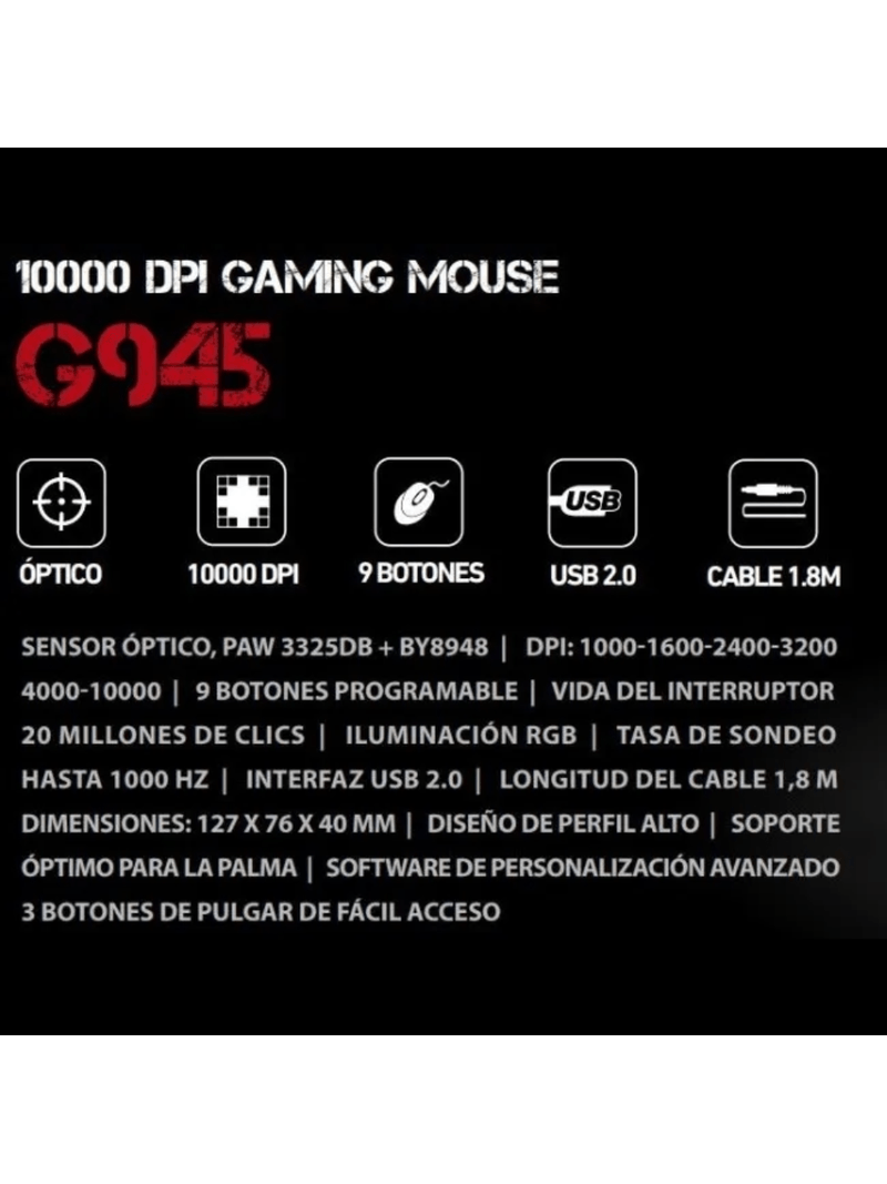 Mouse gamer. Sensor: Optico, PAW 3325DB + BY8948. Resolucion DPI: 1000-1600-2400-3200-4000-10000 (predeterminado). Botones: 9 (programables). Clasificacion del interruptor: 20 millones de clics. Luz de fondo: RGB. Tasa de sondeo: Hasta 1000 Hz. Longitud del cable: 1.8 metros. Soporte de sistema operativo: Windows 7 o más reciente.