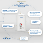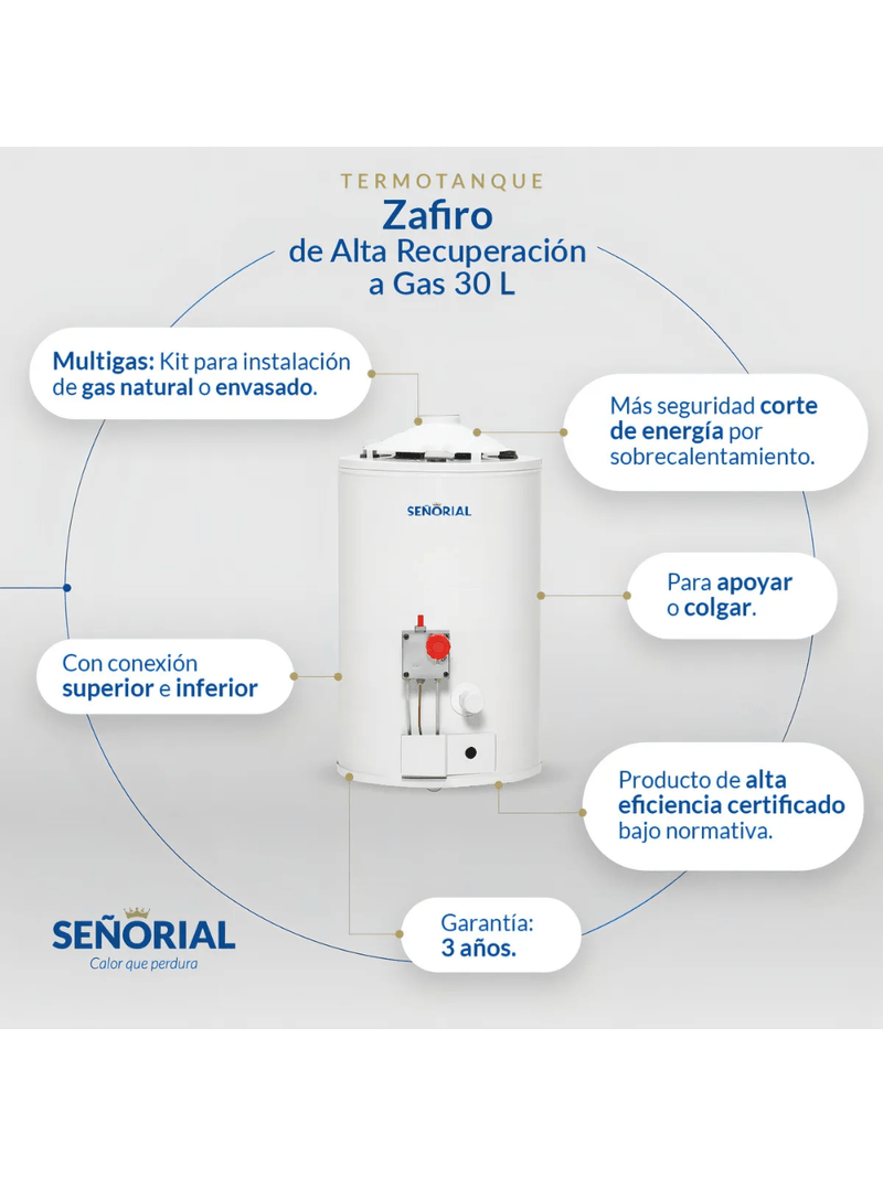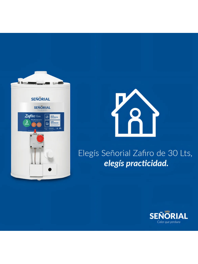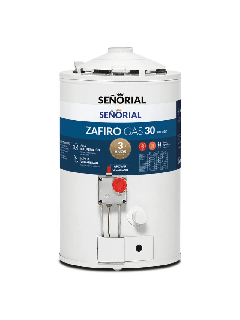 El Termotanque Señorial TSZ30 Zafiro 30L MG es un modelo multigás, lo que significa que puede funcionar tanto con gas natural como con gas envasado. Tiene una capacidad de 30 litros y cuenta con alta recuperación, permitiendo un rápido calentamiento del agua. Su diseño versátil permite instalarlo de pie o colgado, adaptándose a diferentes espacios. Además, incorpora válvula de seguridad por sobrepresión y un piloto analizador, lo que garantiza mayor seguridad en su uso.