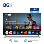 Smart TV BGH 60'' 4K Google TV B6026US6G Características principales • Pantalla 4K UHD de 60’’ con HDR10 y HLG. • Google TV con apps como Netflix, Disney+, YouTube y más. • Conectividad: 4 HDMI 2.1 con ARC, 2 USB, Bluetooth 5.1, WiFi Dual Band. • Diseño frameless con panel IPS. • Dolby Audio / Dolby Atmos / PVR / Timeshift.