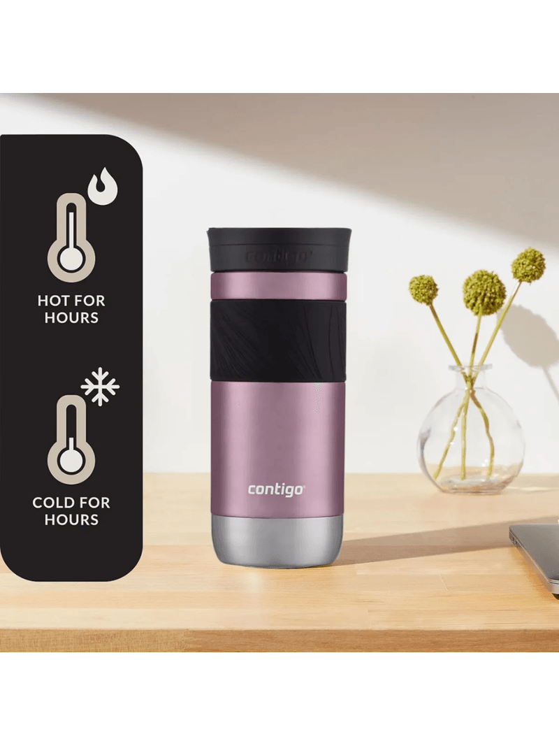 La taza de viaje de acero inoxidable con aislamiento SnapSeal con asa, 473 ml, mantiene las bebidas calientes hasta 9 horas o frías hasta 21 gracias al aislamiento al vacío de doble pared THERMALOCK. La tapa SNAPSEAL de una sola pieza permite beber con una sola mano sin tapas ni tapas para quitar o extraviar y es a prueba de fugas cuando está cerrada. Además, un agarre sutilmente texturizado ofrece una sujeción segura.